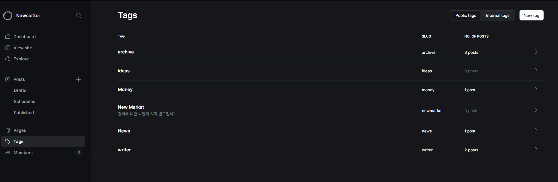 그리고 글을 쓸때 tag를 걸어주면 메뉴에 들어간다.