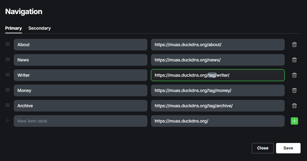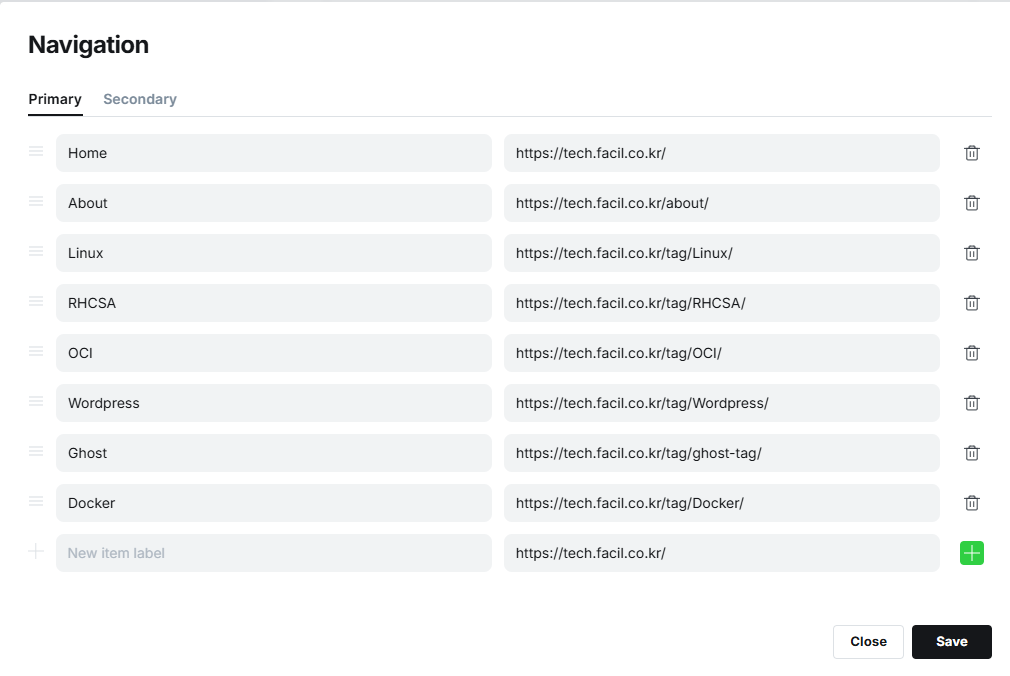 워드프레스나 다른블로그는 메뉴추가 기능에서 바로 추가하면 되지만 고스트 블로그는 조금 다르다.